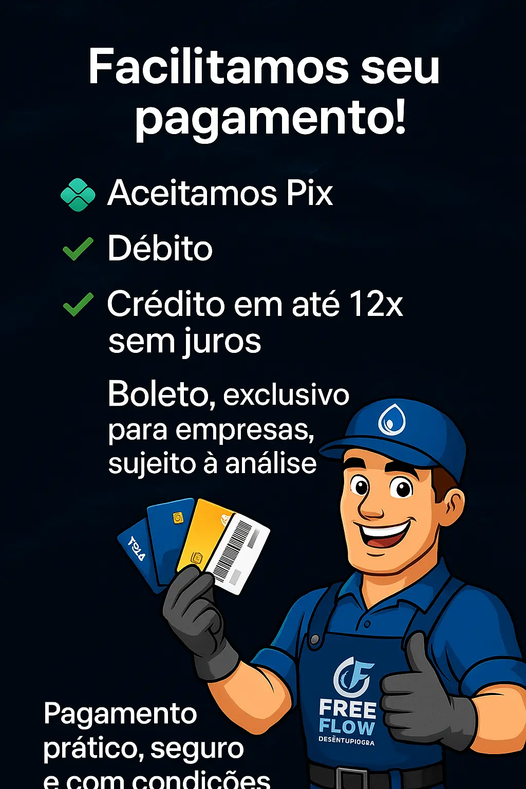 Na Free Flow você resolve seu problema sem pesar no bolso! Oferecemos parcelamento facilitado no cartão, sem juros e com diversas opções de bandeiras. Atendimento rápido, preço justo e condições acessíveis!